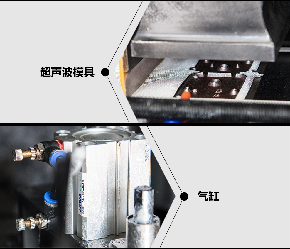 2.設(shè)備采用大功率15KHz超聲波工作并配合增壓缸進(jìn)行下壓沖切,沖切力度大。